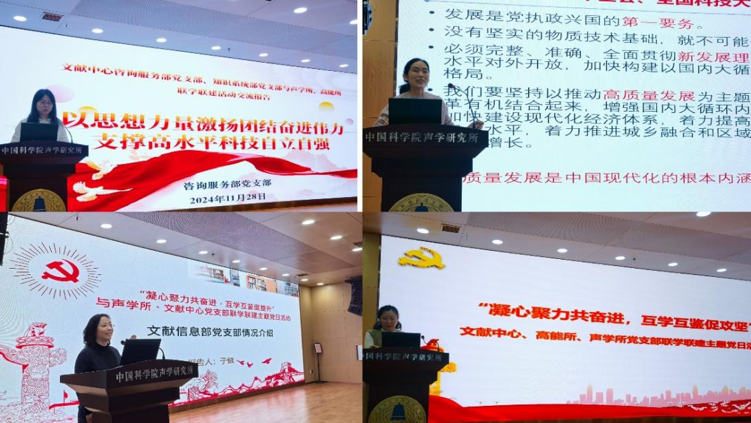 在座谈交流环节,文献情报中心咨询服务部党支部书记刘艳丽、文献情报中心知识系统部党支部副书记李涵昱、高能所文献信息部党支部书记于建、声学所图书馆主管张莉莉分别作《以思想力量激扬团结奋进伟大力量支撑高水平科技自立自强》《落实国家队使命,践行知识系统高质量发展》《高能所文献支部情况介绍》《声学所图情工作经验交流》的交流报告,分享了图书情报工作与党建工作相融合、与科研工作相结合的典型事迹,并结合各自优势提出了对未来工作的计划与思考。