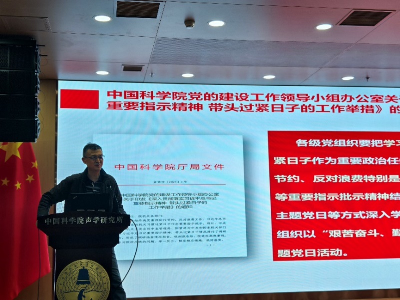 2025年3月12日,声场声信息党总支在科研综合楼1503会议室召开党员大会。会议开展“艰苦奋斗、勤俭节约,带头过紧日子”主题党日活动,并部署2025年度党总支工作。党总支书记王海斌等党员参加会议,会议由党总支副书记张波主持。