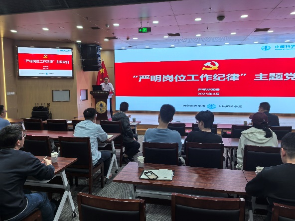 李明庚传达院党组关于“严明岗位工作纪律”专项工作的有关要求,并宣讲在抢占科技制高点背景下开展三项制度建设的重要意义。他在总结讲话中强调,要深刻认识“严明岗位工作纪律”专项工作对科技创新的保障作用,并对开展深入贯彻中央八项规定精神学习教育提出要求,党员干部要在思想上充分重视,强化作风建设,在科研任务中不断锤炼党性、提高思想觉悟、强化使命担当。