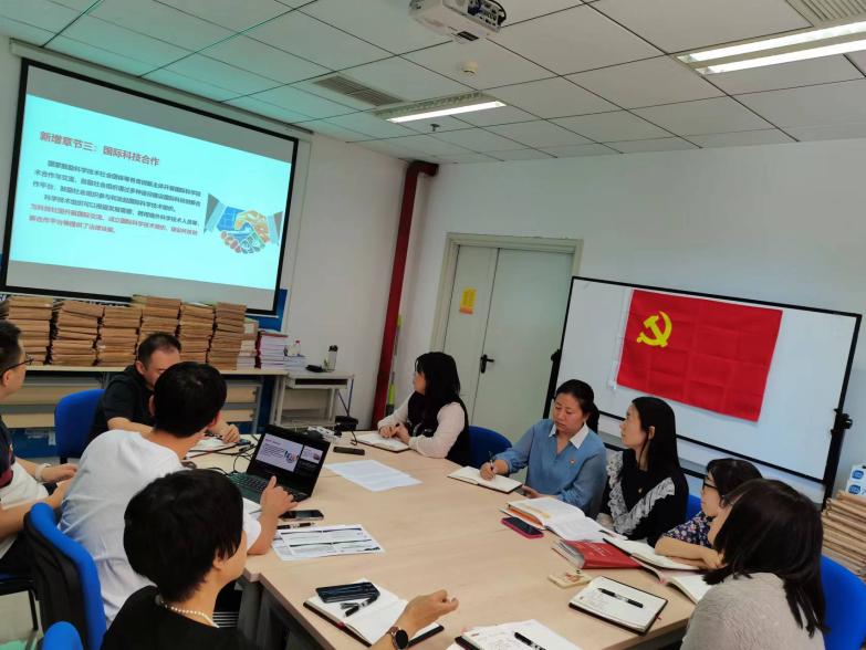 随后,崔爱伟同志带领大家集体学习了《中华人民共和国科学技术进步法》修订的背景、意义、亮点和新增内容。