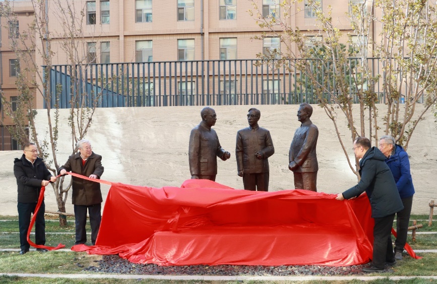 李风华、倪宏、应天林及离退休职工代表柳天明共同为塑像揭幕。
