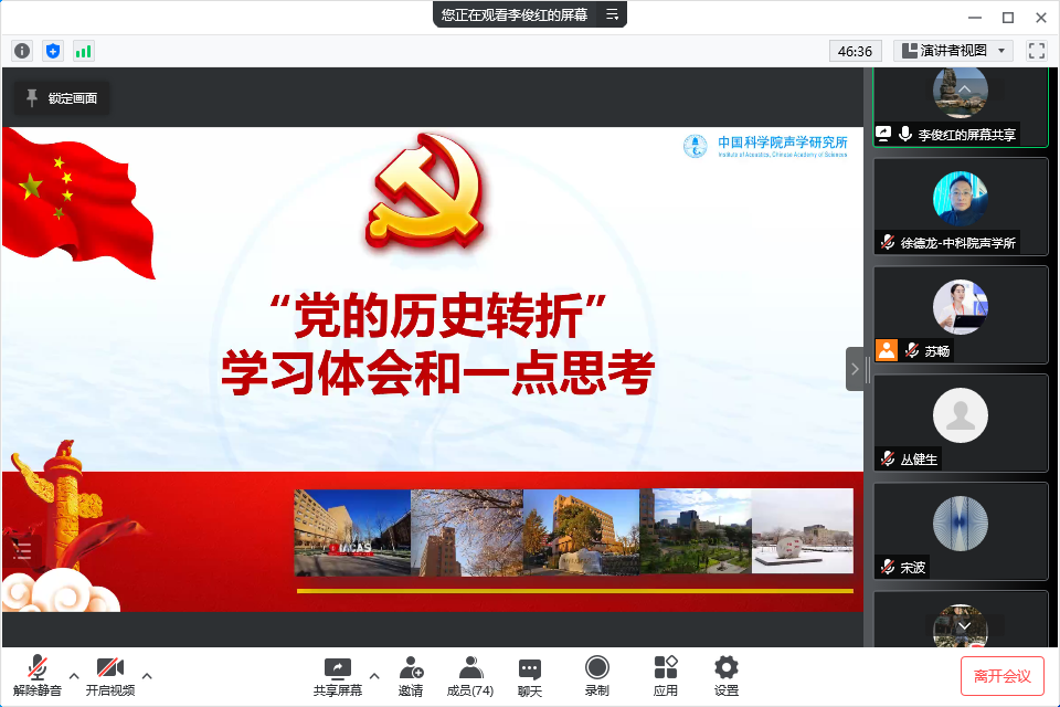6月13日下午,超声学党总支召开线上党员大会,并开展主题党日学习活动。党总支副书记苏畅主持,共74名党员参会。