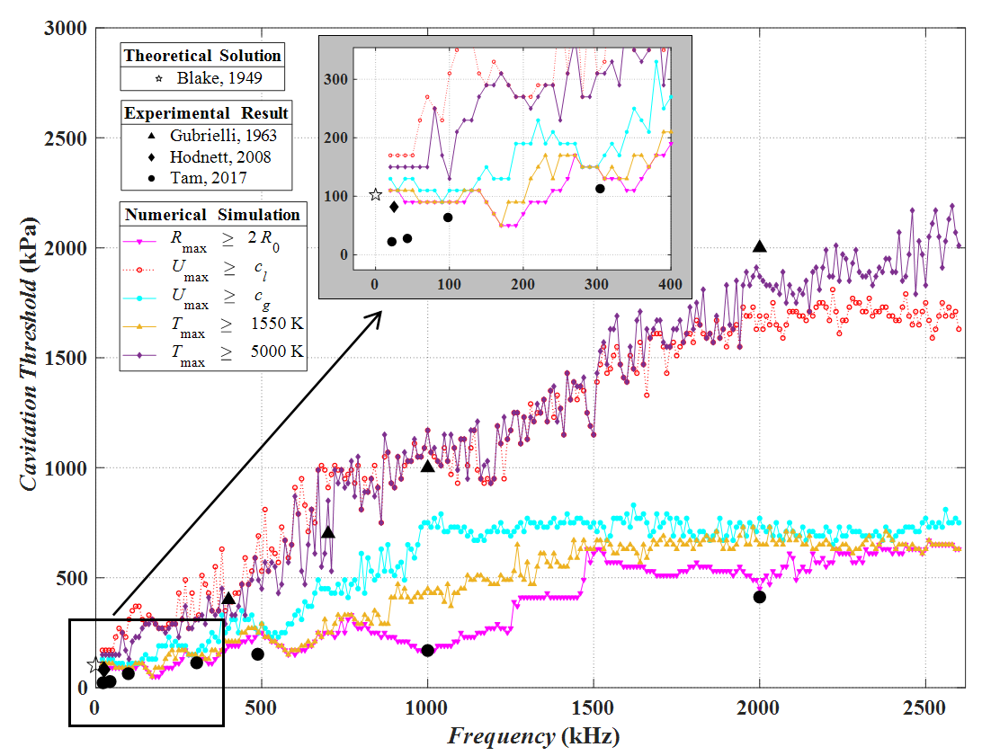 超声空化在肿瘤治疗、药物递送等生物医学领域应用广泛。空化阈值(激发空化的最低声压)的精准预测,是平衡治疗效果与安全性的关键。传统的Blake空化阈值理论未考虑声波频率和介质粘弹性的影响,在一定情况下会对空化阈值的预测造成误差,难以满足现代超声治疗的高精度需求。