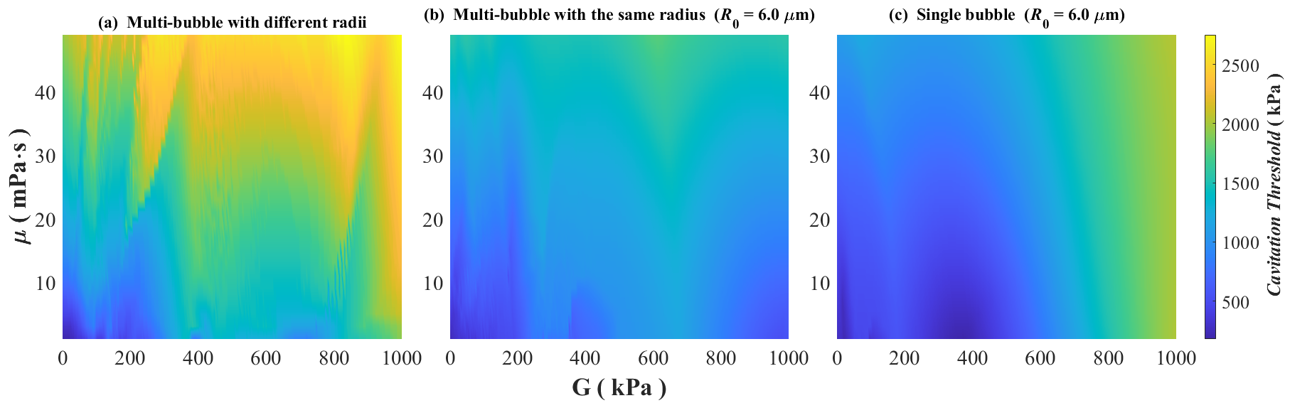 结果表明空化阈值与频率满足幂律关系,空化阈值对频率变化较为敏感;气泡总数增加时空化阈值呈先升后降趋势,该现象源于气泡群辐射声压的非单调特性,打破了“气泡越多越易空化”的传统认知;粘弹性介质的剪切模量对阈值的影响比黏度更显著,且呈现非线性波动,生物组织的弹性特性是空化调控的关键变量。
