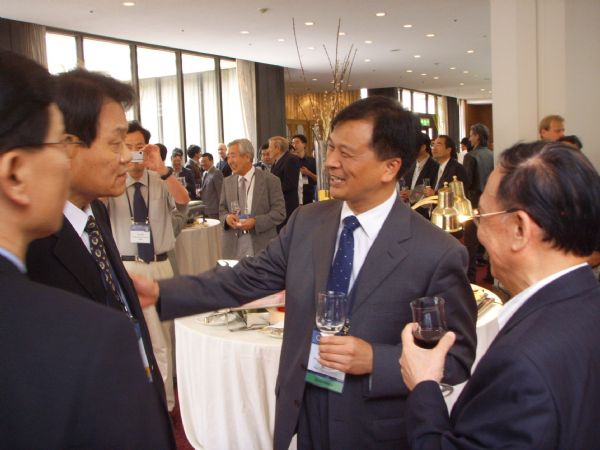 执行主席(左一)、西太平洋声学委员会主席张仁和院士(右一)交谈。