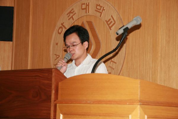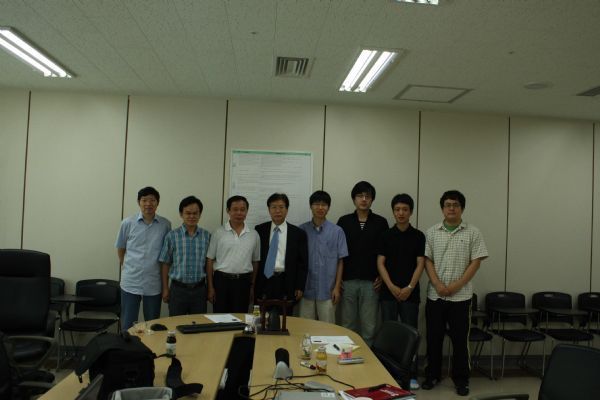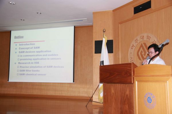 声学所访问团于7月20日下午抵达韩国。21日上午来到韩国亚洲大学电子工程与计算机系微系统实验室,会见了该实验室教授Yang Sangsik以及副教授Lee Keekeun。Prof· Yang于1988年在加利福利亚大学伯克利分校获博士学位,其研究领域为非线性系统分析,微型泵以及微量注射器,是韩国著名微系统专家,曾多次作为IEEE Sensor年会亚洲区主席。亚洲大学微系统实验室系韩国BK21重点实验室,有着较强的科研实力以及一流的科研设备,较早开展了声表面波陀螺仪方面的研究,提出了一种基于行波模式陀螺效应的陀螺仪系统,已发表SCI检索论文数篇。声学所声学微机电系统实验室声表面波课题组与该实验室有着良好的合作关系,签订了一系列合作协议。目前研究工作已经展开,其中,声表面波陀螺仪方面已经相继获得国家自然科学基金委与韩国科技财团的联合资助以及中科院国际合作局的重点支持。此次访问,双方对项目进展情况进行了阶段总结,对下一年度的工作以及学术交流等事宜进行了讨论,决定于2009年12月份由我方派科研人员赴韩方进行学术交流;2010年3月亚洲大学微系统实验室Prof. Yang等将对我所进行访问。此次访问还安排了学术报告。韩国亚洲大学微系统实验室Prof. Lee Keekeun作了“关于声表面波陀螺仪的研究与发展”的报告;声学所王文副研究员作了“声表面波器件在通讯与传感器方面的应用研究”的综合报告。王文副研究员在报告中对声表面波技术在通讯系统以及各种物理、化学传感器方面的应用进行详细介绍,一个小时的报告赢得了阵阵掌声,在场的亚洲大学电子工程与计算机系的学生踊跃提问,参加讲座的还有该学院的教授、硕士与博士研究生以及博士后等。
