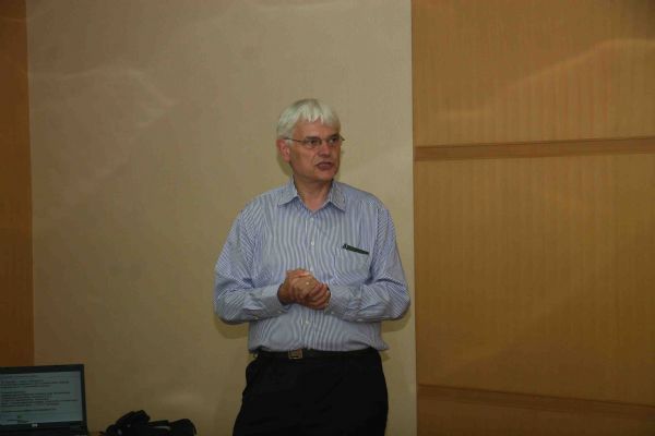在第二个学术报告中,Arnold教授介绍了他们在原子力声显微镜(Atomic force acoustic microscopy)研究方面的最新进展。介绍了原子力声显微镜的成像原理,激发的振动模式和模式振动的数值模拟结果等,报告中,他通过一些实验结果展示了应用这一技术可以对检测的样品进行高分辨率成像,并且还可以应用不同振动模式的特点识别材料的衰减、杨氏模量及压电材料的结构等。相对于传统电子显微镜,这种技术可以提供高分辨率的三维成像、工作过程不受探针与物体之间耦合状态的限制等;但由于探针的直径处在纳米级的尺度,因此成像范围小、速度慢且需要经常检测探针的工作状态是否正常。