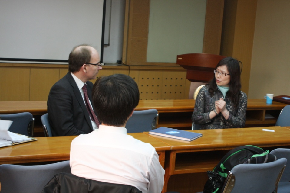 黎瑛主管在学术会议之后向Jon Trevelyan教授介绍声学所对外合作交流情况