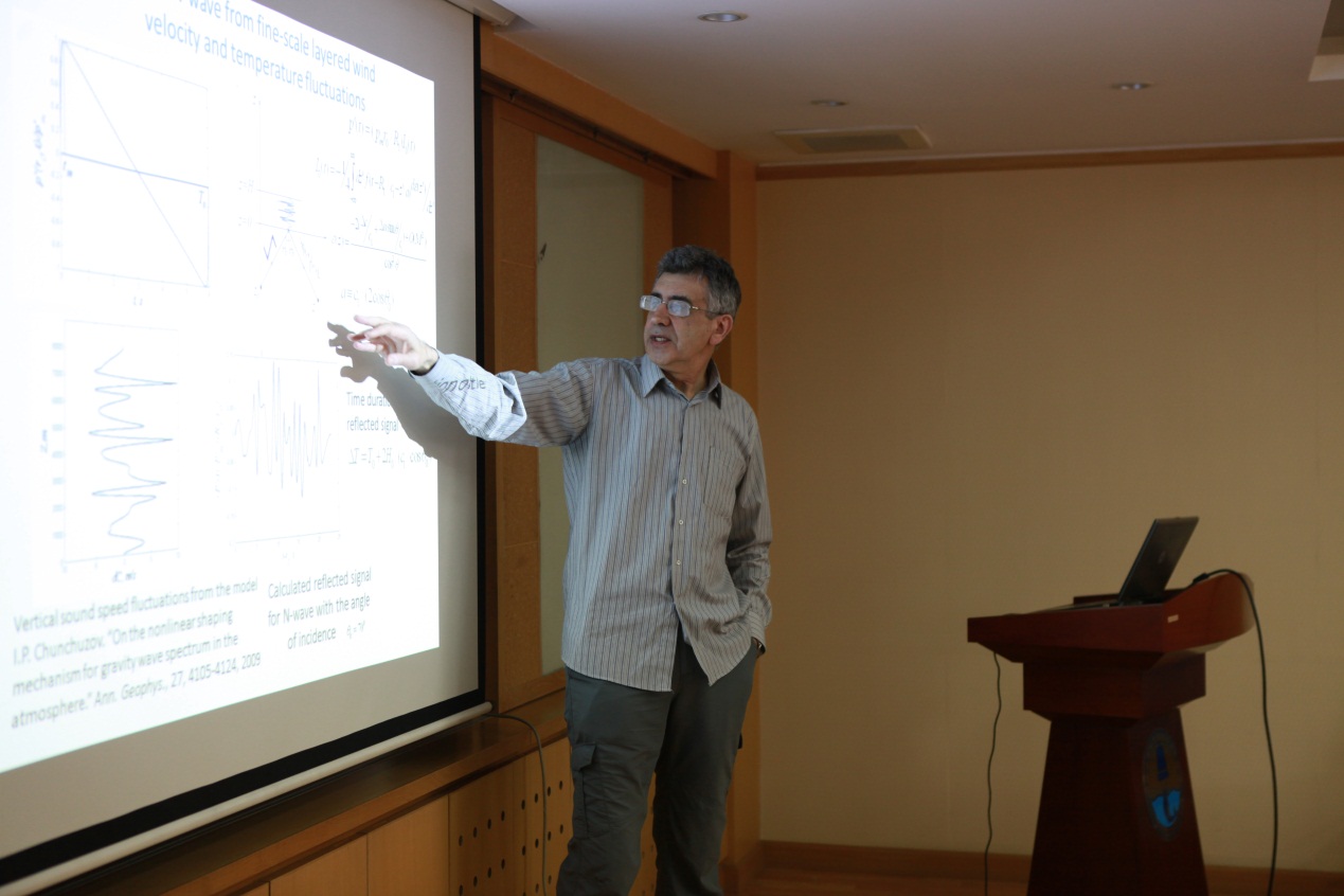 声学所通信声学实验室主任李晓东研究员参加了本次会议并首先对各位到场嘉宾表示了热烈的欢迎。接着,俄方三位专家分别做了学术报告:Igor Chunchuzov做了题为“Retrieval of the atmospheric fine-scale wind velocity structure by using infrasound in the shadow zone”的报告,提出了利用次声波研究大气分层风场的变化方法,能够精确的反演小尺度的风场分布。VitalyPerepelkin介绍了黑海海浪产生的次声波。NadezdaTsybulskaya的报告提出了研究次声信号的一种新方法——形态学分析法(Morphological analysis)。国内的地震局地球物理所苏伟副研究员以及声学所杨亦春研究员分别介绍了各自在地震关联次声波的研究进展,并同与会的俄方和其他中方专家进行了探讨。