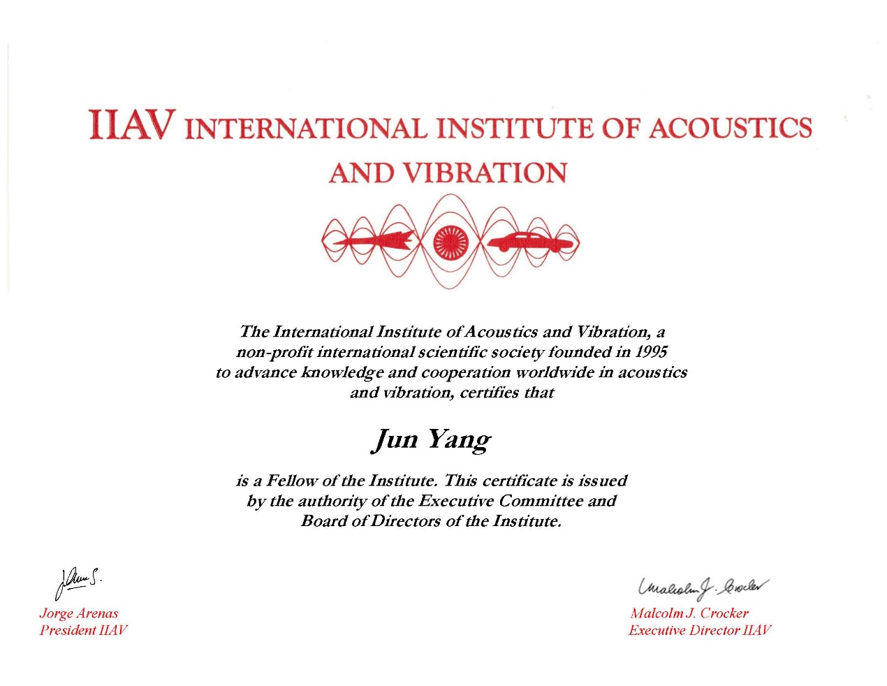 国际声学与振动学会理事长Jorge Arenas和执行理事长Malcolm J. Crocker共同签署的荣誉证书。