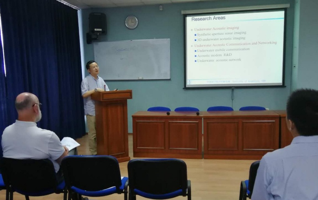 张春华研究员对俄方热情接待和高度重视表示感谢,并向与会的俄方代表简要介绍了声学所概况和学科研究方向。李宇研究员详细介绍了实验室在合成孔径成像、三维成像、水声通信等领域的研究成果以及对北极声学的研究思路和科考试验进展。