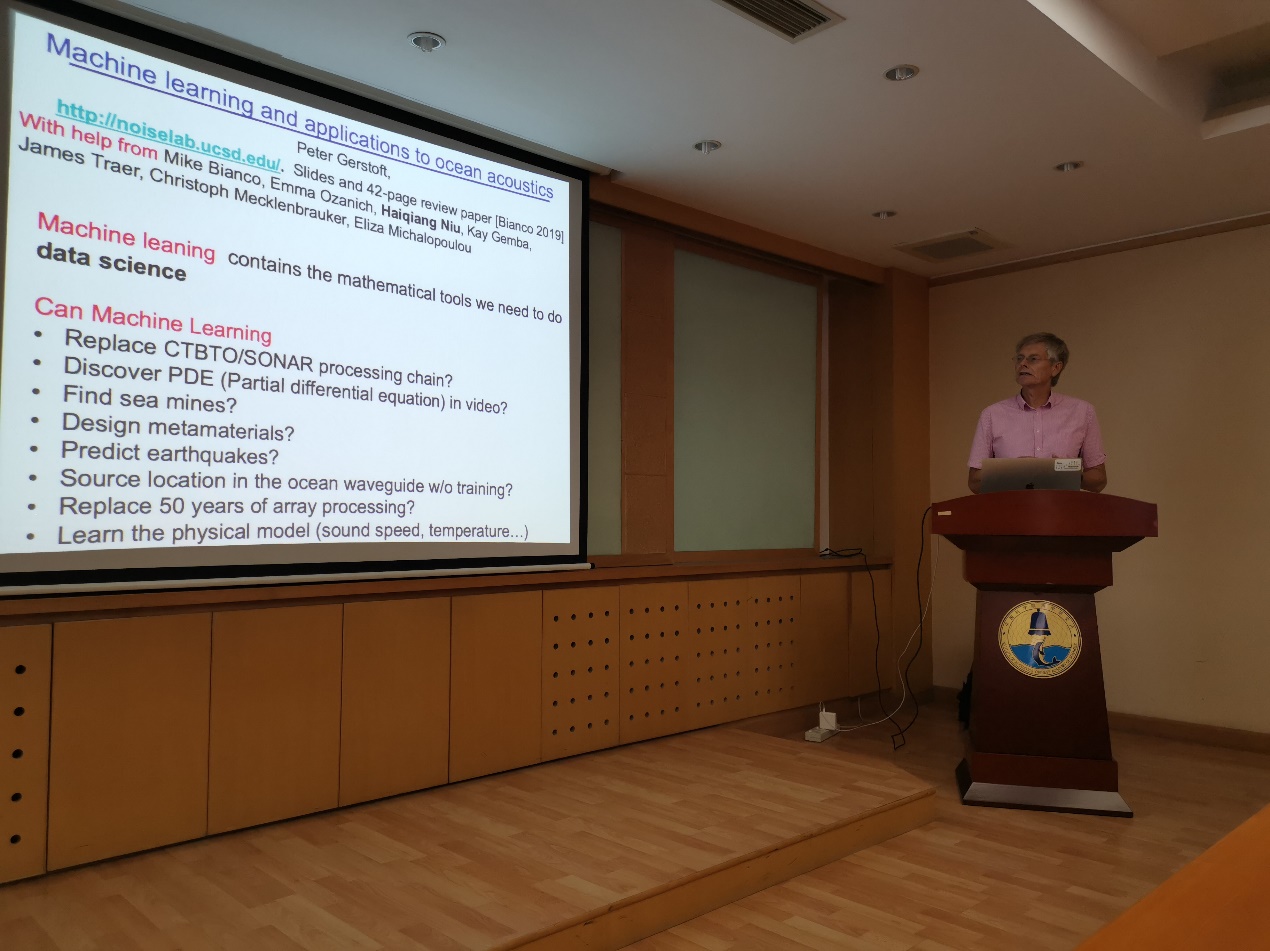 2019719日,应声场声信息国家重点实验室邀请,美国加州大学圣地亚哥分校Scripps海洋研究所Peter Gerstoft教授访问声学所,并在声学所德昭楼218会议室作了题为 Machine learning and applications in ocean acoustics 的精彩学术报告。相关领域的科研人员和研究生参加了报告会。