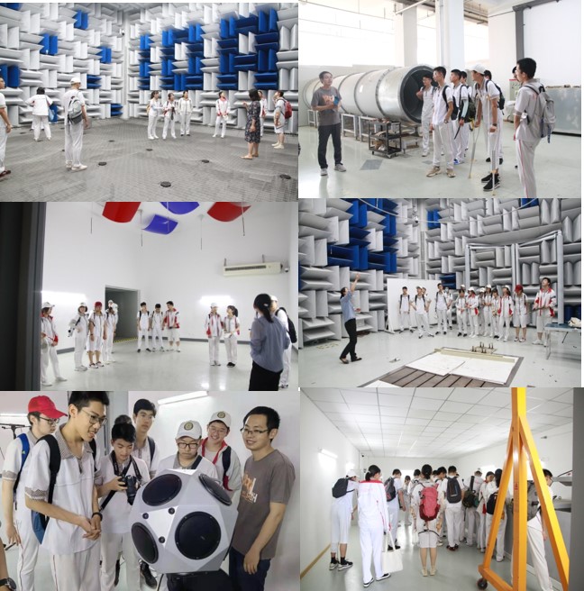 在空气声学实验室,全消声室特殊的实验室构造引发了同学们强烈的兴趣,讲解人员把全消声室的灯光关闭,让同学们体会了一把真正的“无声黑暗世界”;在混响室,讲解人员演示了扎破气球测量混响时间的试验,让同学们更好的理解了混响时间的概念;通过对半消声室、管道消声室、隔声室、驻波管室的参观学习,结合已有的物理知识储备,同学们深入思考,积极提问,同时也体会到了声学知识与我们日常生活如此联系紧密,进一步激发了同学们的学习热情。