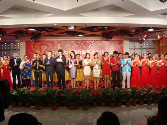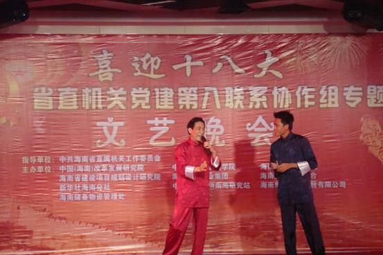为迎接党的十八大胜利召开,海南省直机关党建第八联系协作组“喜迎十八大”专题文艺晚会,8月14日下午在海南日报社演播大厅隆重举行。此次专题演出由南海研究站和海南省直机关党建第八协作组成员单位:中改院、海南日报社、海南电视台、中国热带农业科学院、省农业科学院、省规划设计院、新华通讯社海南分社、海南储备物资管理处、海南博鳌控股有限公司10个单位共同承办。