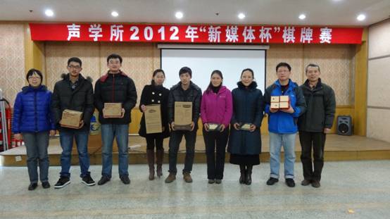2012年12月25日,2012年声学所“新媒体”杯棋牌赛在DSP大楼四层多功能厅圆满落幕。工会、职代会主席李平以及赞助方代表陈君副研究员出席了闭幕式。闭幕式由所团委书记崔杰主持。