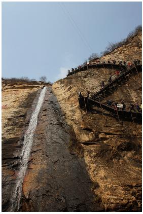 桃源仙谷第一大景点——青龙天梯,一条高约70米的瀑布犹如一条青龙直泄入青龙潭底,几乎垂直的岩壁边沿曲折地安置着一条扶梯,由潭底通往岩顶。大家克服恐高症,相互鼓励,登上岩顶,一睹顶峰的奇景,山峦叠嶂,奇石耸立,潭水清清。