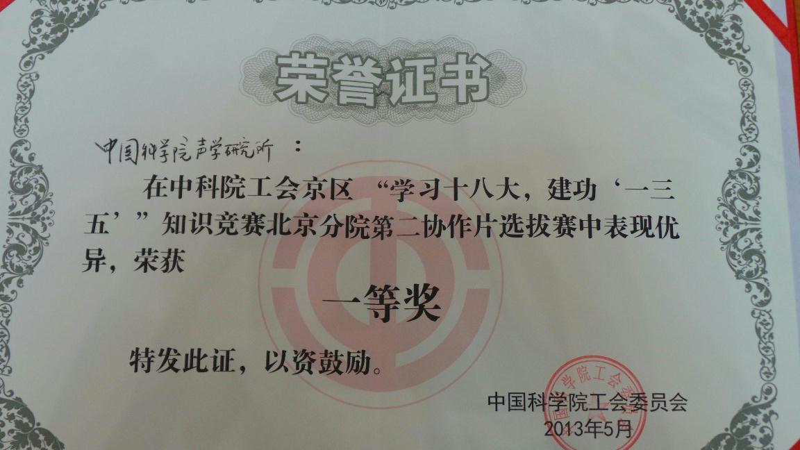 为庆祝十八大的成功召开,切实响应院党委关于学习十八大精神的号召。2013年5月24日上午,中科院工会京区“学习十八大,建功‘一三五’”知识竞赛北京分院第二协作片选拔赛在科技会堂举行,共有10家单位组队参加了比赛。声学所代表队凭借出色的发挥以230分的总成绩获得了并列第一名,将与国家图书馆代表队共同代表北京分院参加全院十八大党史知识竞赛。