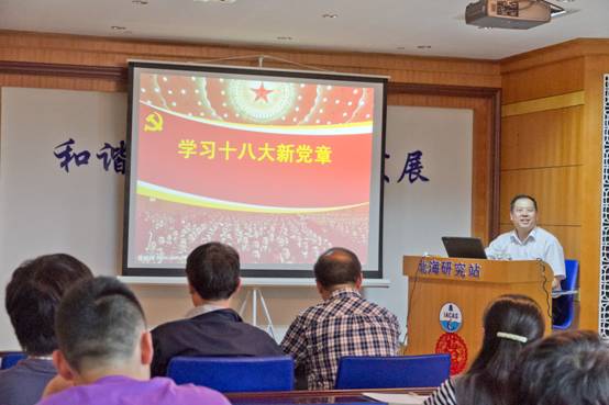 北海站党委书记、副站长张胜坚代表北海站对青岛市委市直机关工委长期以来的关心与支持表示感谢。他要求,我们要以学习新《党章》为契机,进一步增强全站党员职工的责任意识和党性修养,严格自律,立足岗位,结合声学所青岛研发及产业化基地的建设机遇,更好发挥北海站对地方科技发展的支撑和补充作用,在推动地方经济建设中做出表率。
