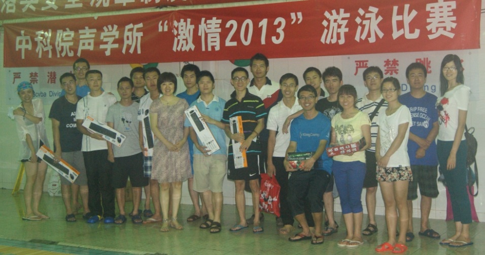 在所有比赛结束后,周秀霞老师为获奖团队及个人颁发了奖项,并向他们表示热烈祝贺。本届“激情2013”游泳比赛在大家的欢声笑语中落下了帷幕,本次比赛极大的丰富了所职工和研究生的文化生活,为游泳爱好者提供一个展示自己技能的舞台,充分展示了声学所人的风采和良好体魄。