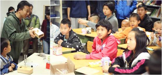 之后,孩子们带领大家到他们上课的地方去参观。很快,几个比较活泼的孩子便与年龄相仿的所职工子女熟络了起来,天真烂漫地玩耍着。学校教学环境相对简陋,但校舍都保持的干净整洁,走廊的墙壁上挂满了一幅幅孩子们精心绘制的作品,一篇篇文字和一幅幅绘画都是孩子们骄傲的成果,他们的健康成长就是对社会给予的关爱最好的回报。在教室里,声学所志愿者为学生们讲解了声学小实验,现场展示了声音的共振现象,引起了小学生们极大的兴趣。