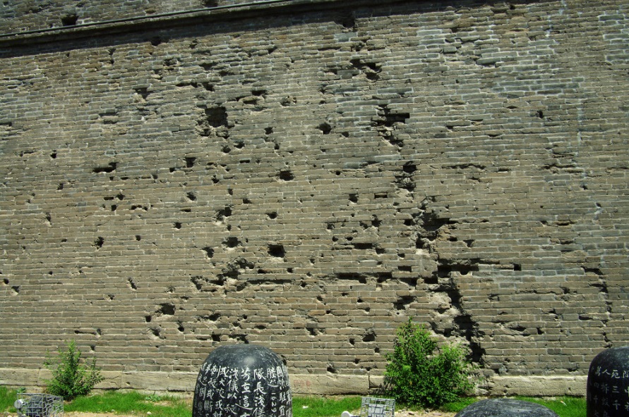 从卢沟桥景区出来,支部一行人进入宛平城。宛平城东门外,紧临城门的城墙边上是一条小道,沿着小道北行,左手边的城墙上保留了当年日军炮击宛平城的弹坑。城墙上随处可见大大小小的洞眼,有些地方洞眼密集,有些地方则相对稀疏,深浅不一,深的洞眼有10多厘米,而在这段城墙的中间部分是一个被毁坏的缺口,尽管进行了修葺,但依然能看出损毁的痕迹。眼前的景象不仅让人回想起当时战争的画面,更加让人怀缅为抗日战争不屈奋斗的革命烈士,也感慨今天的幸福生活来之不易。
