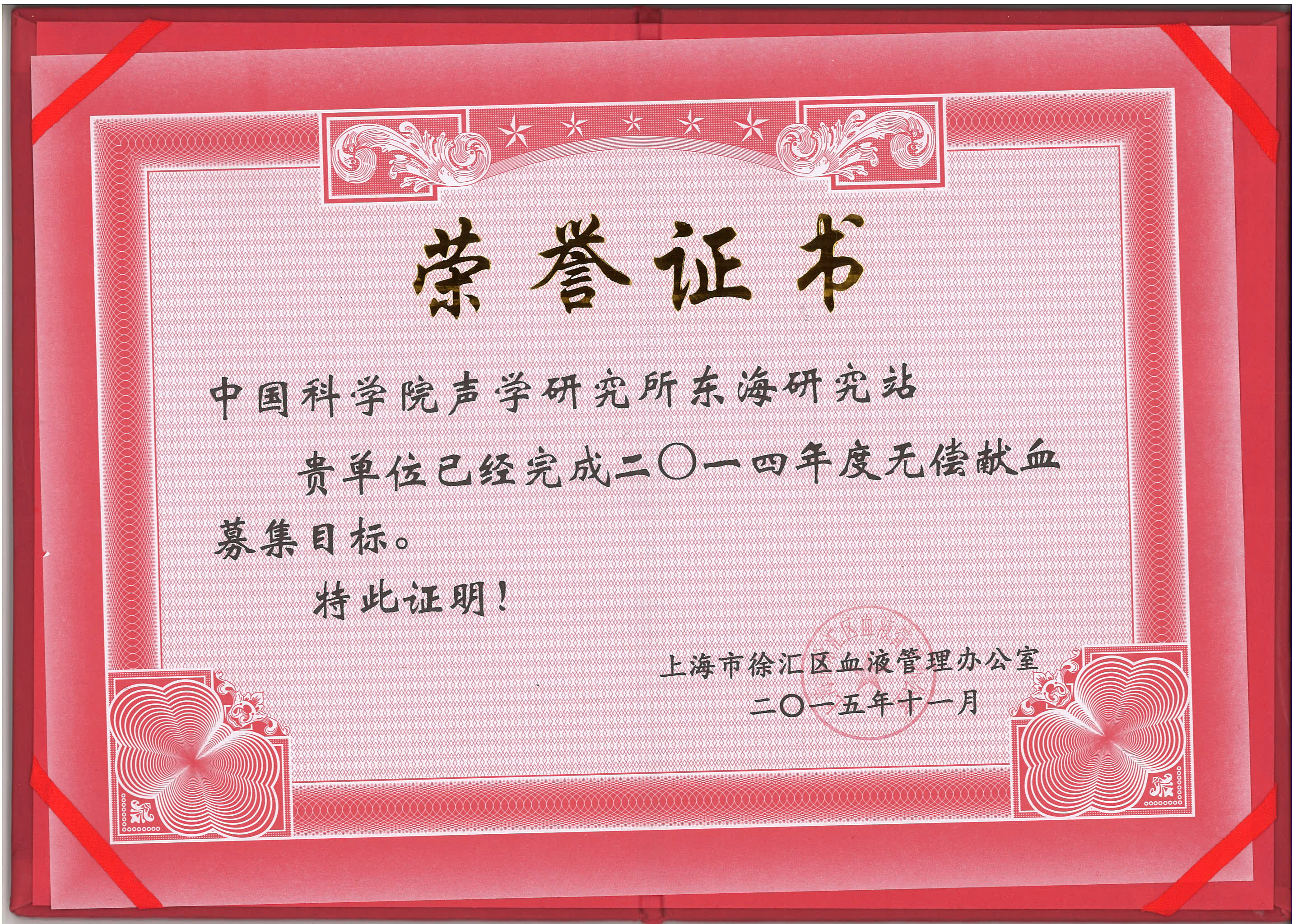 为弘扬社会美德,积极参与社会公益事业,东海站根据徐汇区印发的《关于做好2014年徐汇区无偿献血工作的实施意见》通知精神,组织职工、研究生前往徐汇区血液管理办公室进行无偿献血,圆满完成徐汇区分配的无偿献血量募集目标,并获得“徐汇区完成2014年度无偿献血募集目标”荣誉证书。