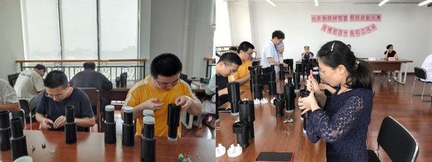 其次是投弃式温深探头壳体的组装赛段。温深探头在量产的过程中,壳体是通过手工拼接组装的。因此要求职工既能掌握拼接技巧,又能眼明手快,在保证质量的前提下尽量提高生产效率。比赛要求职工拧紧接头螺丝,尽快完成五组壳体的组装工作。完成后由裁判计时,同样再将赛品匿名编号,由评委检查接头和壳体安装质量,分别提供时间分数和质量分数,最后综合评定比赛排名。