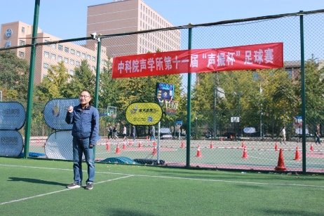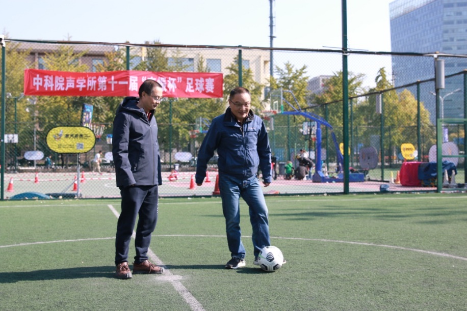 2021年10月20日,天空瓦蓝瓦蓝的,偶尔飘来一朵小小的白云,天空下绿色的足球场上热闹非凡。在这秋风习习的深秋季节里,为引导广大职工参与全民健身活动,充分贯彻全民健康理念,以健康的体魄投身科研、强身健体,同时为我所职工、学生提供一个锻炼的平台,彰显科研人员风采,由所工会举办、足球协会承办的第11届“声振杯”足球赛开幕。党委书记、副所长、工会主席倪宏,噪声与音频声学实验室主任程晓斌,超声学实验室主任陈德华,工会常务副主席周秀霞出席开幕式。