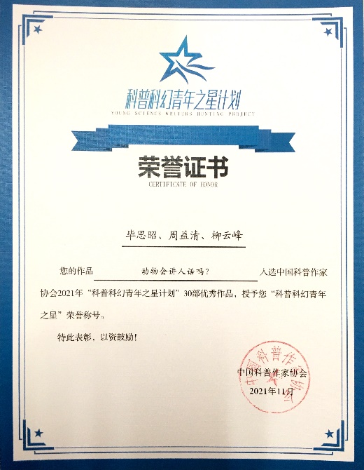 近期,中国科普作家协会2021年“科普科幻青年之星计划”获奖结果揭晓,声学所研究生毕思昭、周益清、柳云峰创作的科普作品《动物会说人话吗》入选优秀作品,三位作者被授予“科普科幻青年之星”荣誉称号。