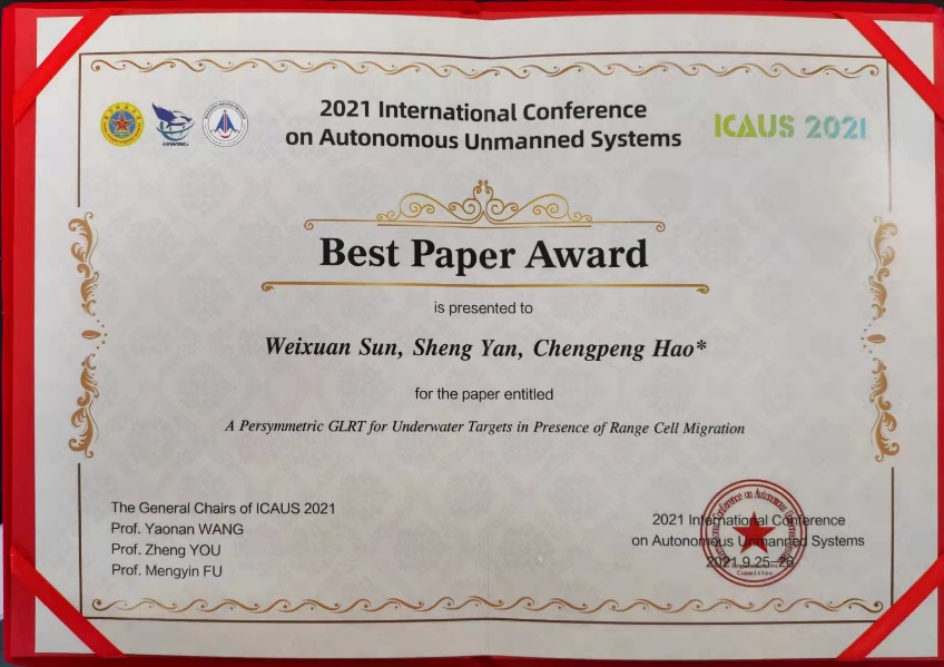 2021925日至26日,由国防科技大学、北京海鹰科技情报研究所联合国内优势单位主办的国际会议2021 International Conference on Autonomous Unmanned Systems (ICAUS 2021)在长沙顺利举行。中科院声学所水下航行器实验室硕士研究生孙苇轩在郝程鹏研究员指导下撰写的论文A Persymmetric GLRT for Underwater Targets in Presence of Range Cell Migration获得了2021年度最佳论文奖。