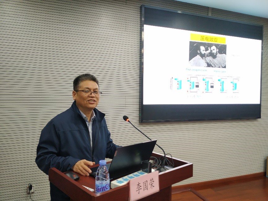 李国荣作了题为“压电效应和应用”的学术报告,从压电效应的基本物理原理开始,浅显易懂地将压电原理分享给青年学者,并讲述了压电陶瓷的分类,以及不同类型陶瓷的主要应用领域,最后结合声学所东海站的特色,表达了共同研究和设计性能优异声学换能器的期许。