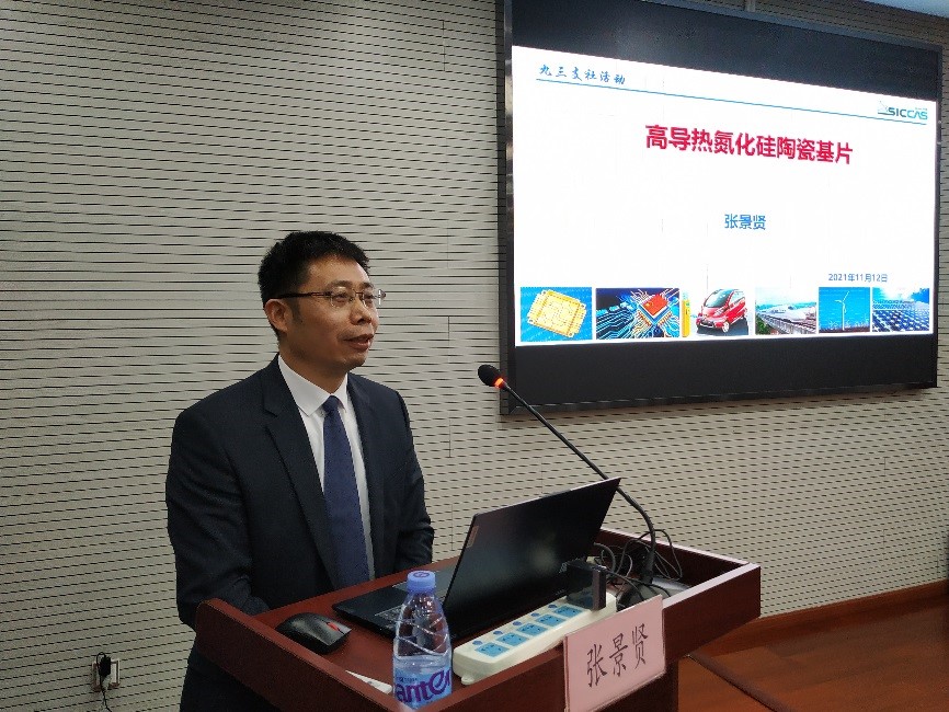 张景贤作了题为“高导热氮化硅陶瓷基片”的学术报告,介绍了导热材料的应用价值和目前被国外技术“卡脖子”的难点,从氮化硅的导热基本原理、流延成型和变形控制三大难点出发,讨论了可行的解决方案。通过加入碳元素,降低氮化硅中氧含量,解决了氮化硅全国产的技术难题。