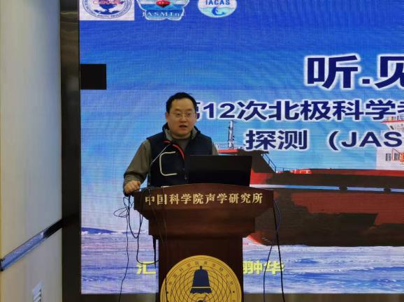 卫翀华作《听·见·花开北冰洋——第12次北极科学考察暨北极加克洋中脊国际联合探测(JASMInE计划)中的声学观测》的报告。报告首先介绍了第12次北极科考的整体概况,而后,展开介绍了加克洋中脊深部地质结构的重要研究意义、声纳浮标等极地声学装备的实验方案设计和极地水声学实验的开展情况,阐述了极地水声学实验对理解低、高频信号冰下混响及散射规律,冰层覆盖下声场传播规律与频率、深度的关系等的重要意义。最后,报告分享了科考船上的精彩生活,以及对我国北极科考事业发展的感想。