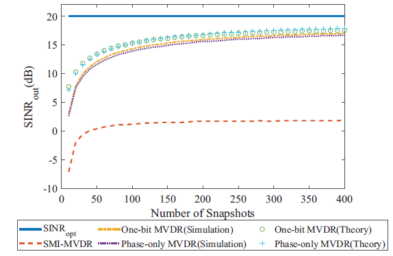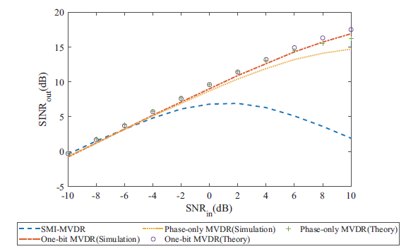 实验结果表明,一比特MVDR及相位MVDR波束形成器具有比以往MVDR波束形成器更快的收敛速度,且对导向矢量误差及离群值较为鲁棒。另外,输出信干噪比的理论值与仿真实验结果基本吻合,证明了理论推导的准确性。