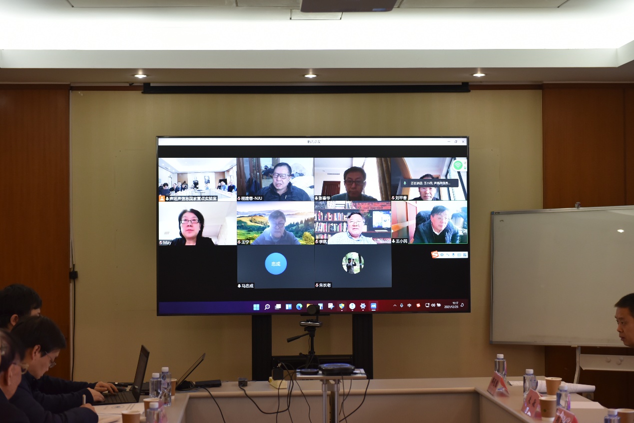 颜永红研究员、刘晓东研究员、贾晗研究员、崔寒茵研究员、戚聿波副研究员和吴敏助理研究员分别作了题为《基于咳嗽音的新冠检测研究》《高分辨率地形探测声纳在搜救中的应用》《低频宽带吸隔声器件快速设计与优化算法》《临近空间声探测研究》《深海直达声区垂直阵目标被动定位方法》和《水下航行器平台集群目标探测与混响抑制技术》的学术报告,展示了实验室本年度取得的代表性研究成果。学术秘书秦继兴副研究员汇报了2020年度开放课题的执行情况和2021年开放课题的申请情况。