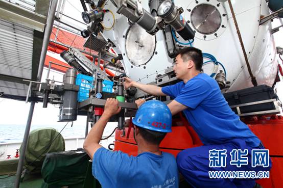 6月14日,参试队员给“蛟龙”号安装水下采样装置。当日,“蛟龙”号7000米级海试团队为潜水器安装上压载铁、采样篮等各种下潜所需的设备,为6月15日第一次下潜试验做好准备。受今年第四号热带风暴“古超”影响,试验海域海况仍然无法满足潜水器下潜条件,原定于6月14日进行的第一次下潜试验推迟至15日进行。新华社记者罗沙摄