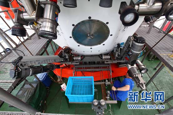 “蛟龙”号上安装的采样设备(6月14日摄)。当日,“蛟龙”号7000米级海试团队为潜水器安装上压载铁、采样篮等各种下潜所需的设备,为6月15日第一次下潜试验做好准备。受今年第四号热带风暴“古超”影响,试验海域海况仍然无法满足潜水器下潜条件,原定于6月14日进行的第一次下潜试验推迟至15日进行。新华社记者罗沙摄