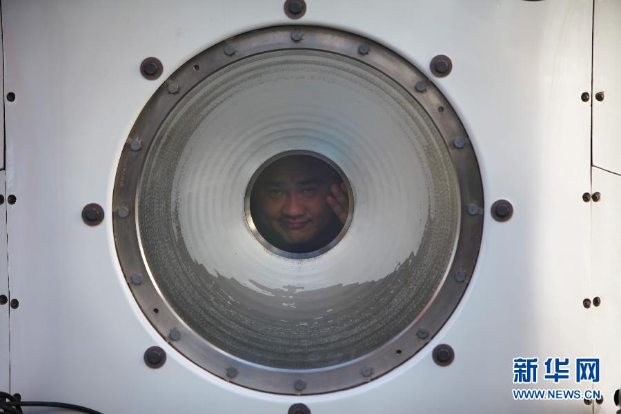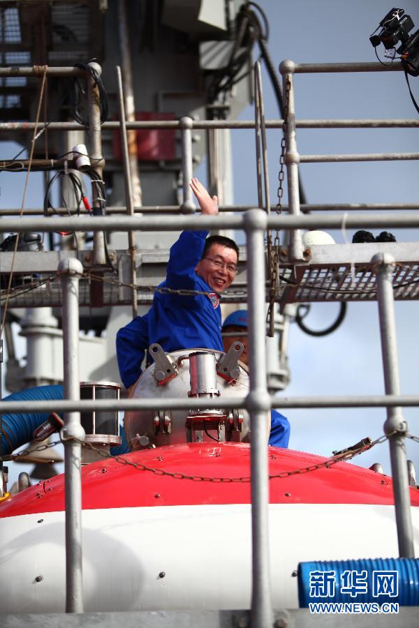北京时间6月15日7时,3名试航员乘“蛟龙”号载人潜水器开始进行7000米级海试第一次下潜试验。这是试航员崔维成进入“蛟龙”号(6月15日摄)。新华社记者 罗沙 摄