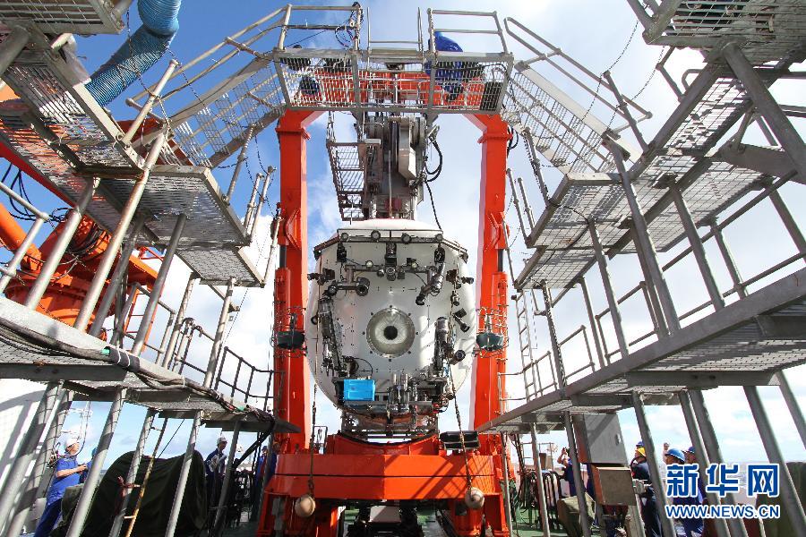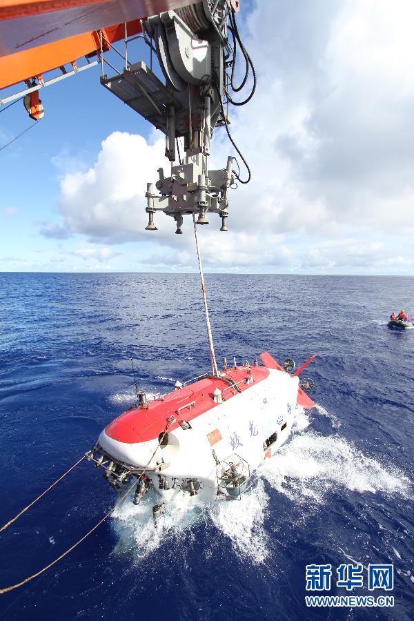 6月15日拍摄的试验中正在被放入水中的“蛟龙”号。北京时间15日7时,在西太平洋马里亚纳海沟试验区,3名试航员乘“蛟龙”号载人潜水器开始进行7000米级海试第一次下潜试验。 新华社记者罗沙 摄