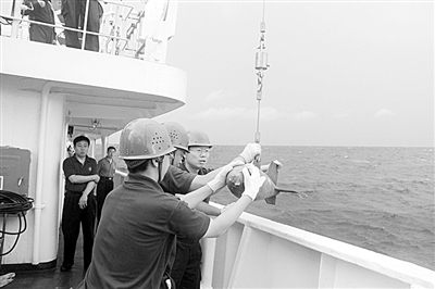 负责水声通信的中科院声学所海试队员在“蛟龙”号下潜前布放声学吊阵