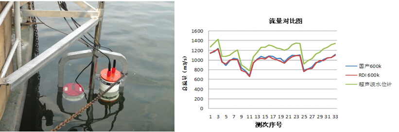 2015年5月11日,在江西峡江站进行了5个测次国产600kHz声学多普勒流速剖面仪与SontekM9的流量测验比测,测得的流量最大差异为3.7%。完成了与缆道流速仪的流量测验比测,得到的流量的差异为1%,验证了国产ADCP在中小河流流量测量的适应性。本次试验中,国产声学多普勒流速剖面仪还完成了与缆道流速仪的定点流速比测试验、采用3体船进行流量测验试验,以及采用无线方式进行测验数据的远程传输试验。
