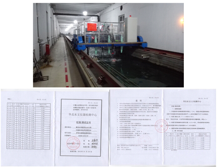 2015年1月15日至20日在华北水文仪器检测中心,在标准流速仪水槽中对3套国产600kHz声学多普勒流速剖面仪完成了底跟踪速度精度和测流精度的检定。鉴定结果为送检的3套国产设备的底跟踪精度均优于±0.5%±5mm/s,第一层流速精度优于±1%±5mm/s,并由中心出具了检定报告。