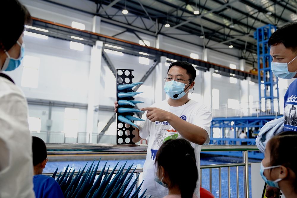 ↑522日,东海站工作人员向参观者介绍“消声尖劈”工作原理。