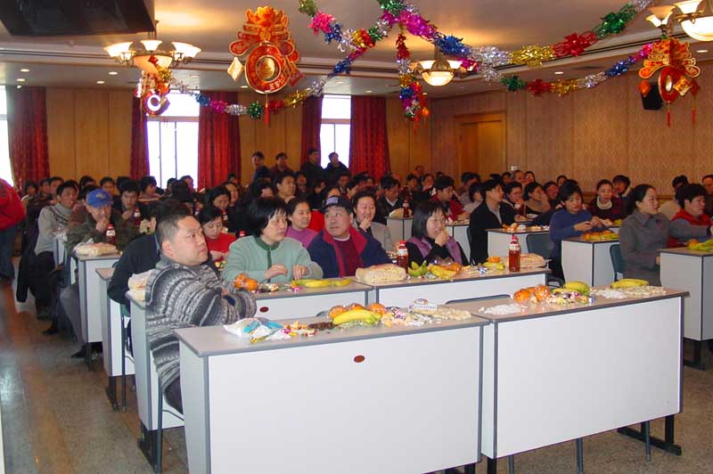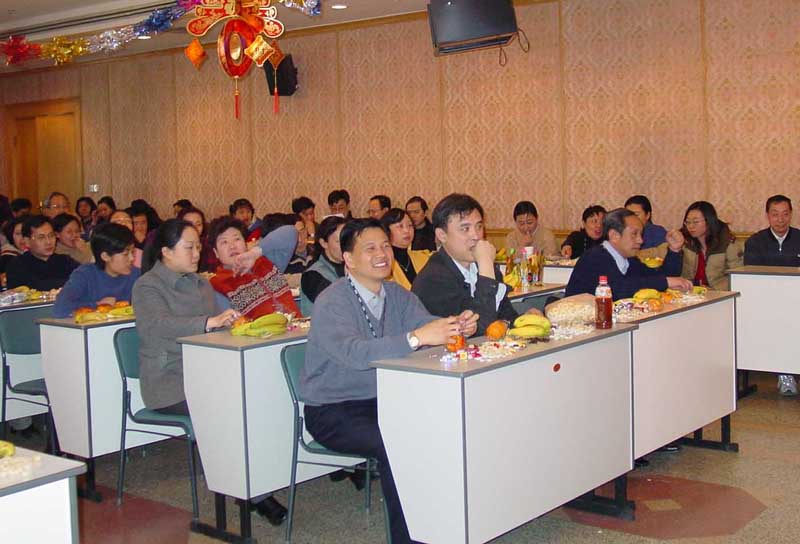 1月29日下午声学所200余名职工在DSP大楼多功能厅举办2003年新春团拜会,所长、党委书记田静,副所长潘锋、副所长、党委副书记景荣才及所长助理黄正参加了团拜会。