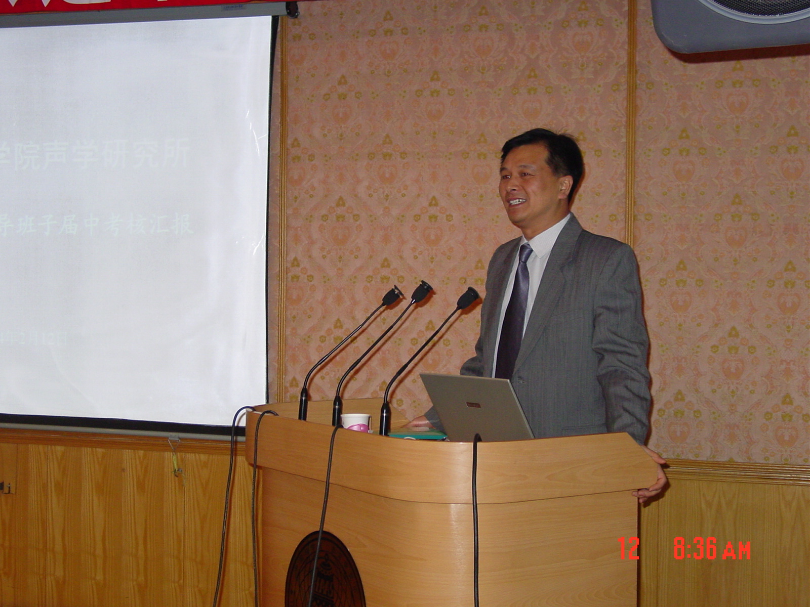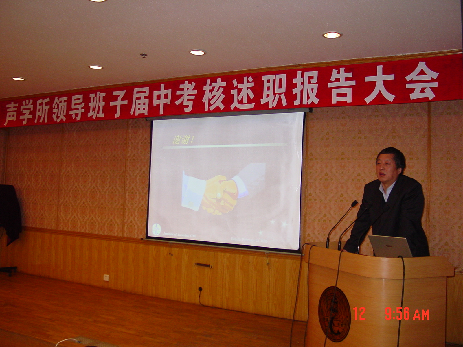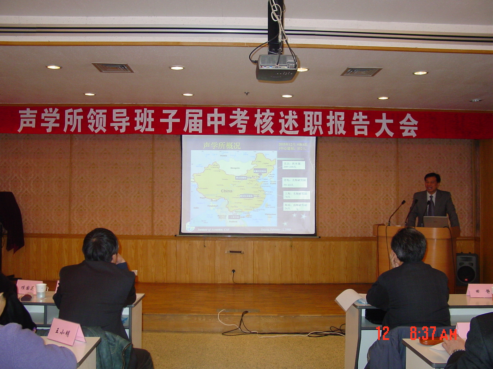 2004年2月12日,中科院人教局刘毅局长、高技术局桂文庄局长、京区党委项国英常务副书记、人教局李和风副局长、京区党委组织部李安林部长、人教局领导干部处王小明处长及院相关部门徐兵、钱景阳、张放同志等一行九人莅临声学所,进行领导班子届中考核。