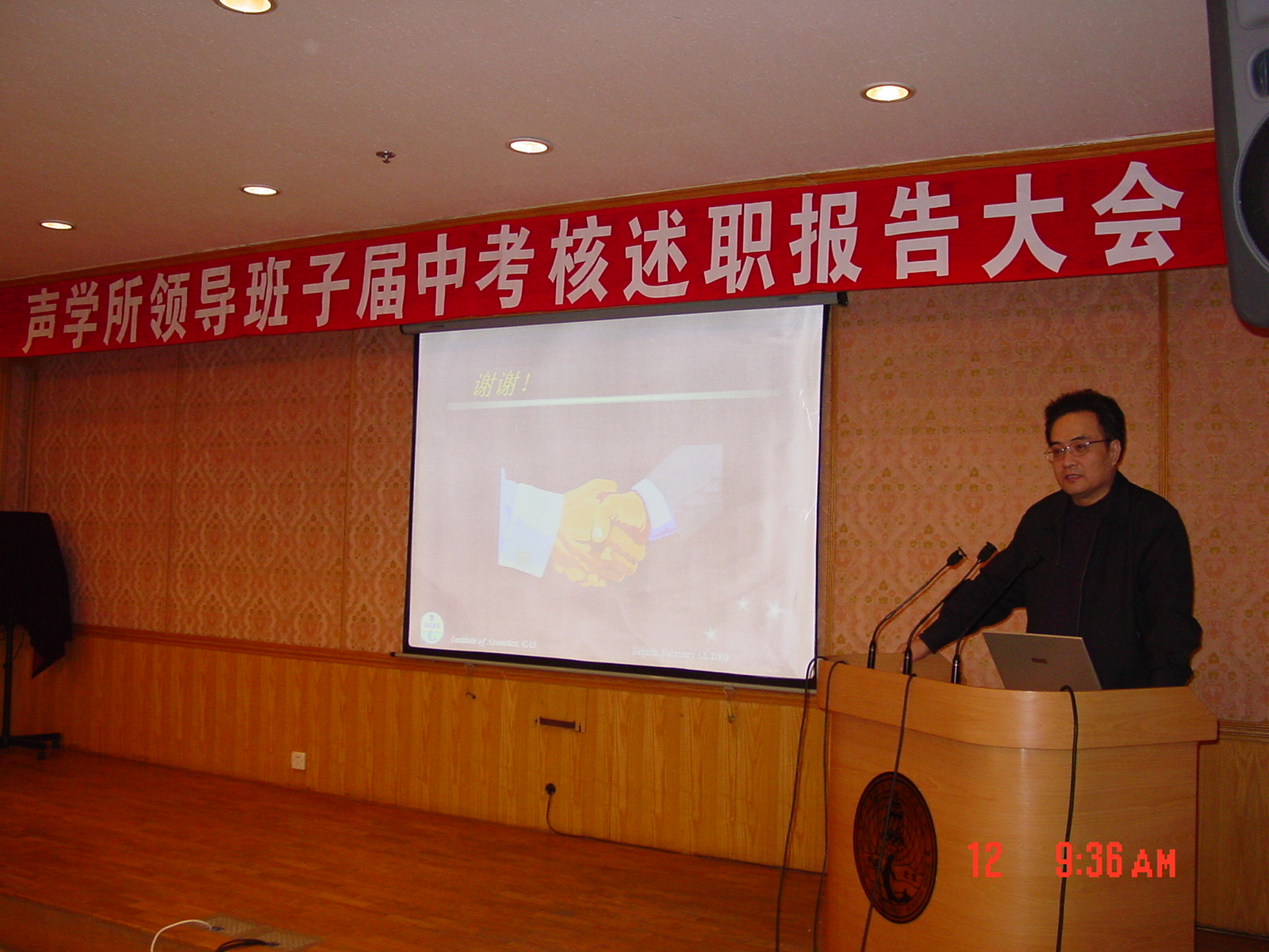 上午声学所党委副书记景荣才同志主持召开了由中层以上干部、副研以上科研人员、党委委员、纪委委员、党支部书记、职代会主席团成员约80余人参加的述职报告大会。田静所长代表党政领导班子作了述职报告。刘毅局长和桂文庄局长分别作了讲话,考核组人员当场向参会人员发放了“研究所领导班子考核民主测评表”,对领导班子成员进行了民主测评。