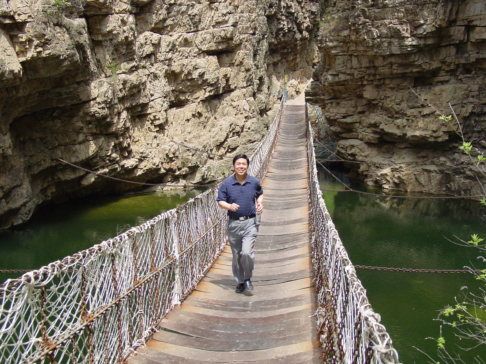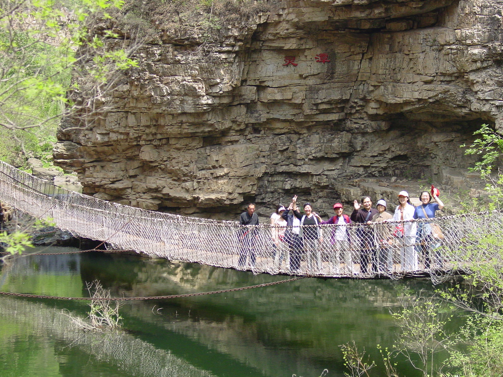 大峡谷纵深3公里,谷底崎岖而平缓,比较适宜老人行走。幽静的谷内春山如黛,空气清鲜,龙门湖银光闪闪,悬空栈道曲径通幽,老同志们聆听鸟儿鸣潭,赏观池池碧泉,踏上铁索桥趣味横生,仰望万丈崖唯见一线天,谈论着新奇感受,享受着自然之美。史国宝教授年逾古稀,可身体仍然硬朗,高兴起来忍不住还要小跑一段山路,停下来时购了山货又买小松鼠,充满了惬意与童趣地随着大家一直爬到峡谷的尽头____响潭。只见30余米高的响潭瀑布飞流直下,串串水珠洒向空中,仿佛散花般迎接着客人的到来。望着沐浴在大自然中的人们,人与自然如此的和谐,我们不由得衷心祝愿离退职工就像这常年喷涌不息的响潭之水,活力四射,生机勃勃。