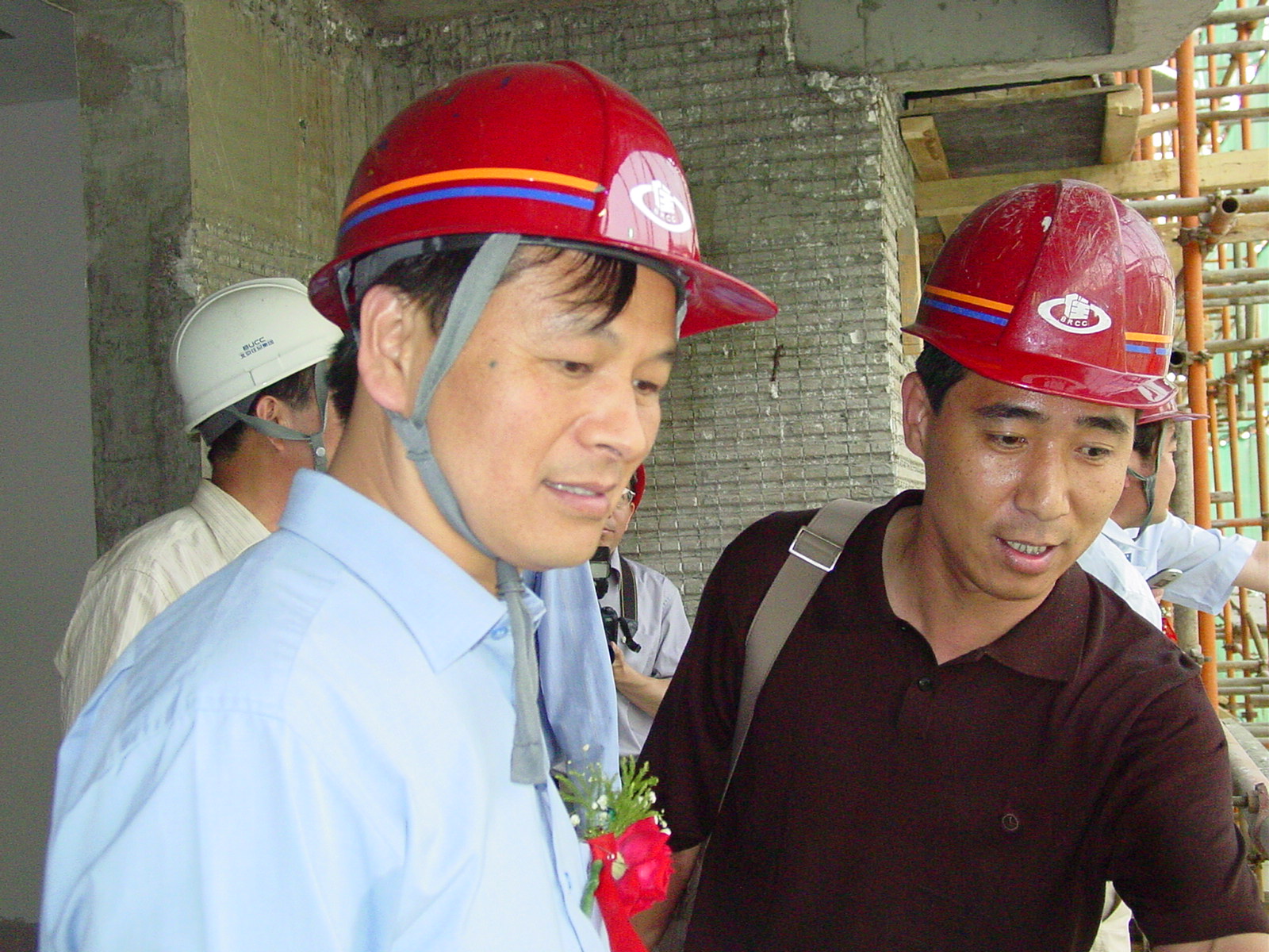 封顶仪式后,大家参观了地下二层车库及第二层初装的几种标准户型住房,对施工质量、住房宽敞等表示满意。并在总包方会议室召开了简短的座谈会,听取了各方领导主要工作的介绍和后阶段的安排,对年底按时竣工充满信心。尤其是听了总包方项目经理杨文勇对一年来主要施工节点,即按时开工、地下基础、出正负零、结构封顶等施工情况较为详细的介绍,取得的成绩是显著的。目前项目部情况:材料质量管理达标,北京市施工红牌(样板)工地,通过北京市结构长城杯质量检查,优秀项目经理部。他们的目标是:高质量,求高效,倡信誉,让科技人员住上放心房。