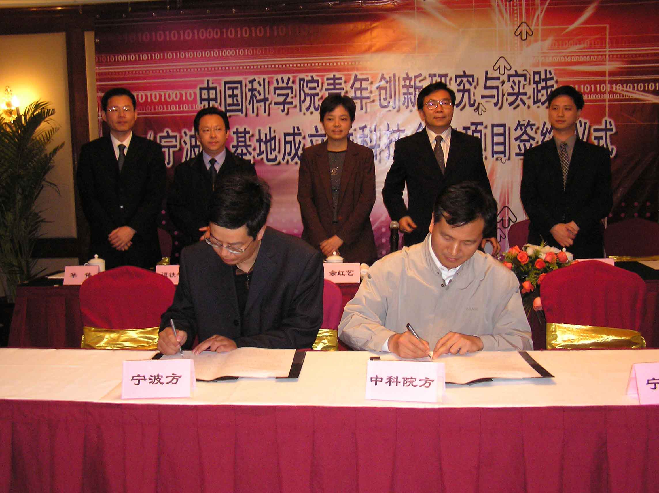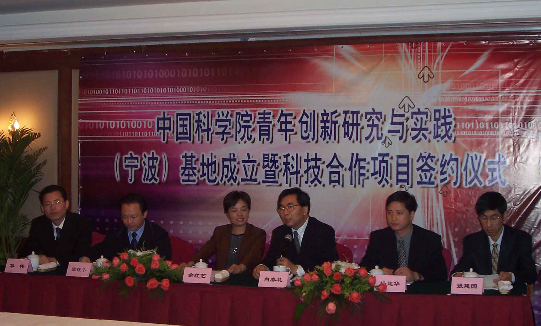 10月20日晚17:30分中科院青年创新研究与实践(宁波)基地成立暨科技合作项目签约仪式在宁波开元大酒店华光厅隆重召开。中科院副院长白春礼、宁波市副市长余红艺、声学所所长田静、自动化所所长谭铁牛、计算所副所长樊建平、宁波市科技局副局长张建国等领导同志出席会议。中科院副院长白春礼、宁波市副市长余红艺先后发表讲话。