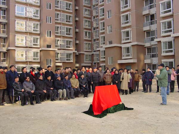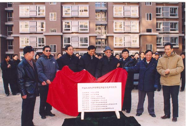 潘副所长主持揭碑和竣工仪式,他简要回顾了住宅楼的建设过程:声学所新住宅楼的建成,来之不易,经过了几代人的共同努力,从征用土地、规划筹备、基建程序报批、楼宇建设等等。是各级主管部门的关怀支持,所历届领导的不懈努力及全所职工的大力支持的结果。本工程于2003年6月正式开工,按计划于2003年12月出正负零,并于2004年6月主体结构封顶,直至今天顺利竣工。在声学所、北京市建筑设计研究院、北京住总集团有限责任公司住三分部、北京鸿厦基建工程监理有限公司合作四方的共同努力下,本着“高质量,求高效,倡信誉,让科技人员住上放心房”和“誓夺结构长城杯”的共同目标,经过575天的日日夜夜,克服了施工场地狭小,排除了雨季基坑护坡崩塌等危险,通过了北京市结构长城杯检查组的两次实地检查,取得了北京市安全文明施工样板工地等等,终于取得了今天的成果。不论从外形结构,内部配套设施以及户型布局等,已成为中关村东路线上一道亮丽的风景。